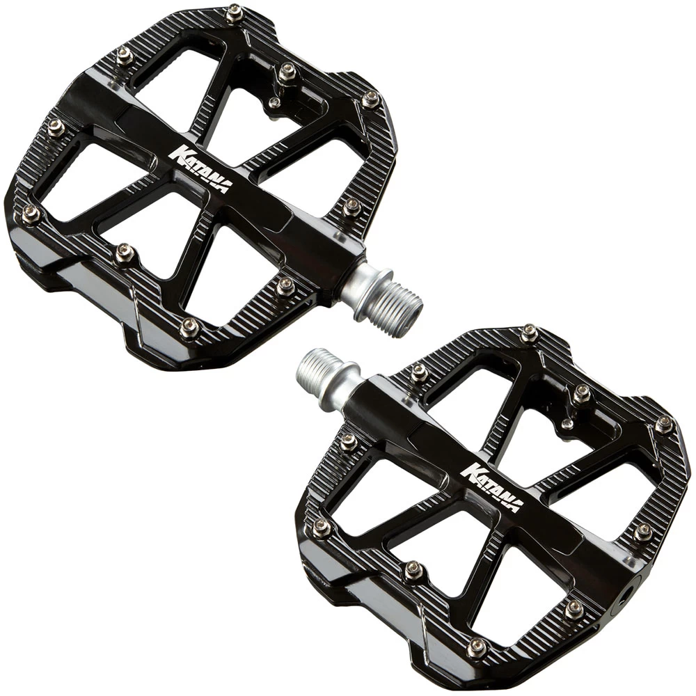 Die flachen Katana Blade Pedale bestehen aus einem robusten Aluminium-Korpus und sind mit jeweils zehn Evo-Pins für den nötigen Grip auf allen Trails versehen. Der Alu-Pedalkörper und die CNC-gefrästen Achsen sorgen in Verbindung mit hochwertigen Kugellagern für eine hohe Lebensdauer in jedem Einsatzbereich, selbst unter härtesten Bedingungen. Blade steht für flach, robust und schnell!