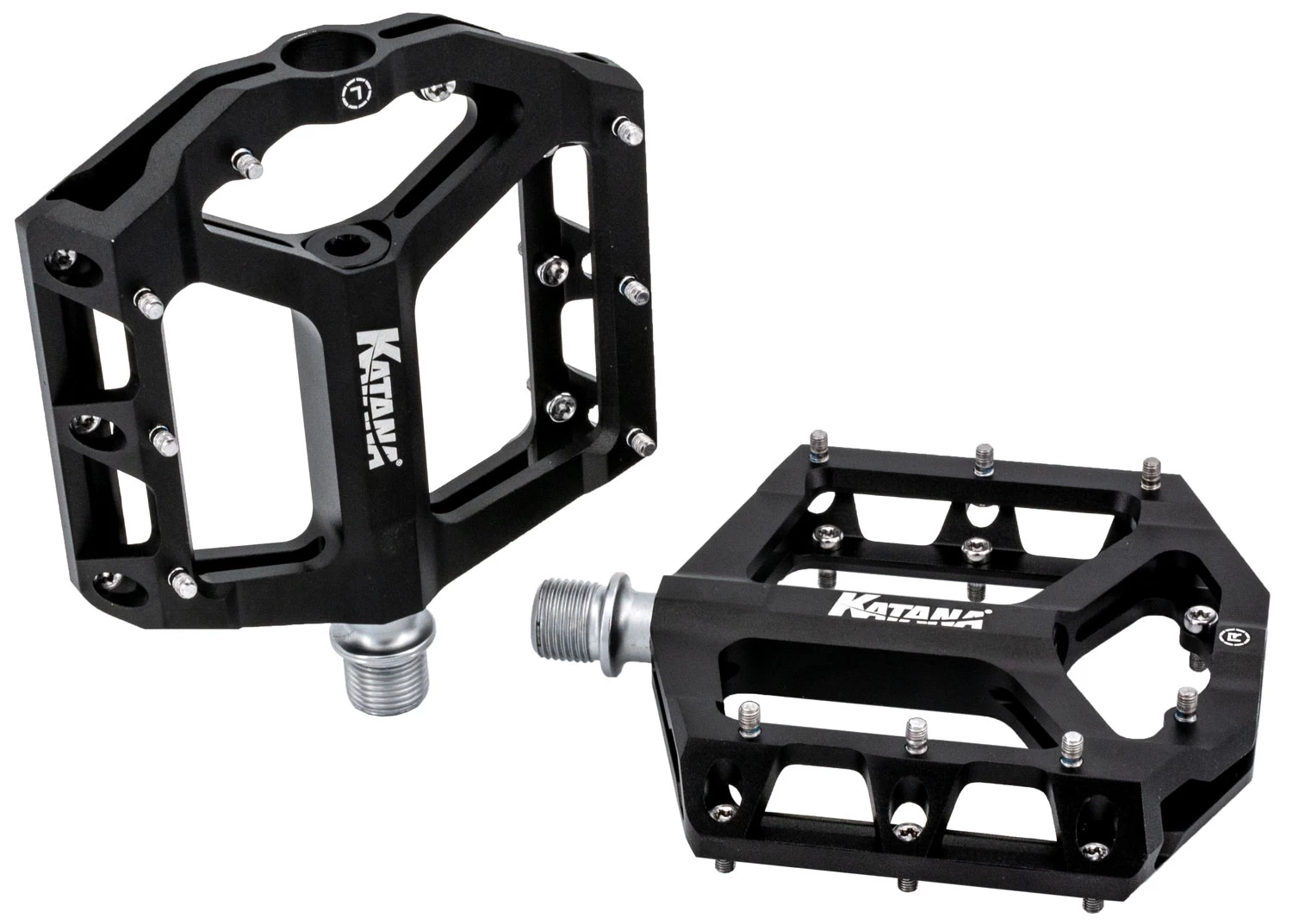 Die Fire Blade Plattformpedale von Katana verfügen über einen sehr leichten Aluminium-Korpus und extralange Pins für optimalen Grip. Dank der hochwertigen Industrielager, der matten Oberläche und der verwendeten Materialien sind diese flachen MTB-Pedale auf geringes Gewicht, eine lange Lebensdauer und größtmögliche Vielseitigkeit ausgerichtet. So sind sie nicht nur für alle Situationen vom anspruchsvollen Trail bis zur täglichen Pendelstrecke geeignet, sondern machen sich auch am Trekkingrad oder E-Bike gut!