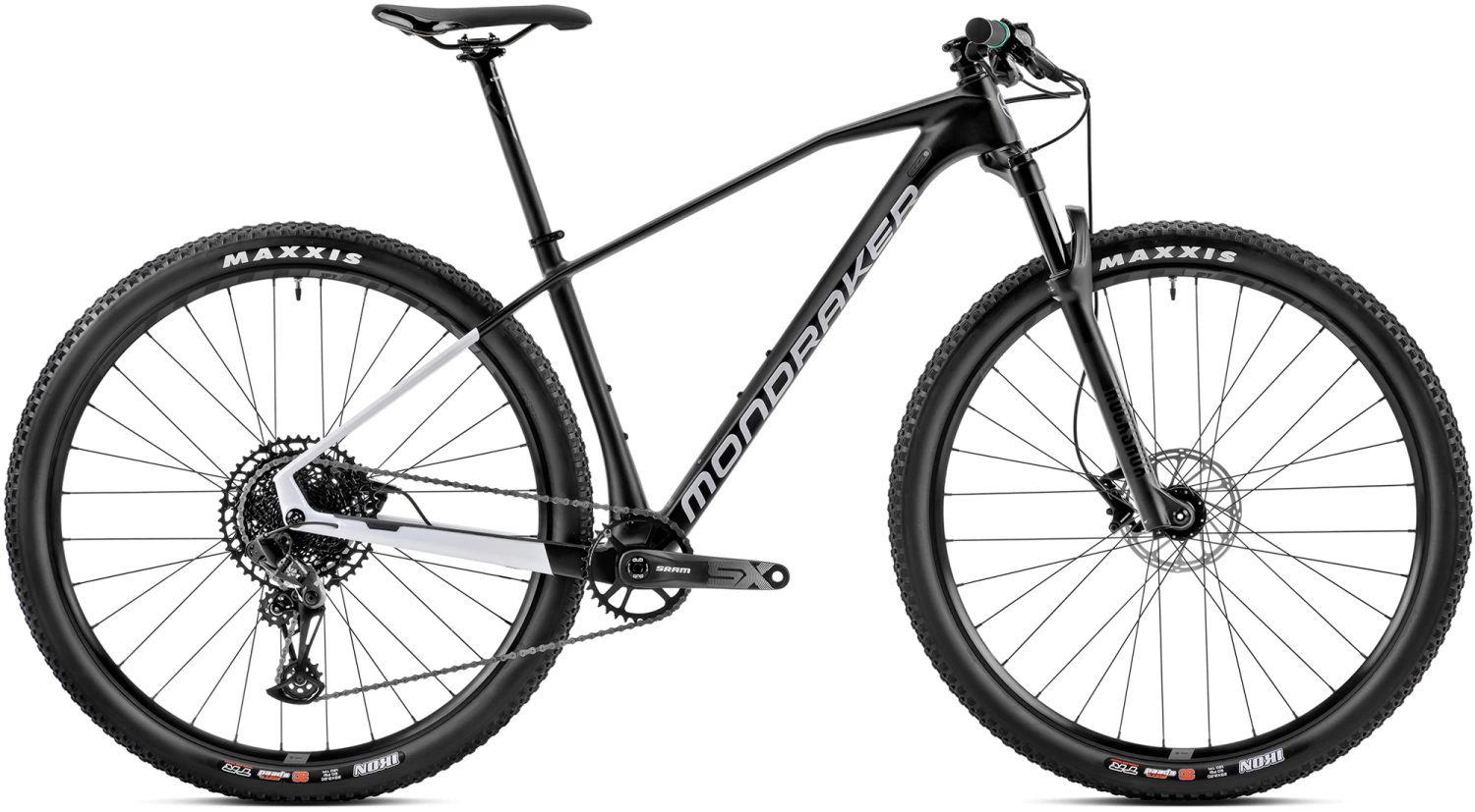 Der auffällige, stabile und richtig steife Carbon-Rahmen besticht nicht nur durch Komfort und Design, sondern kommt auch mit der innovativen Mondraker Forward Geometry: der längere Reach, der durch das verlängerte Oberrohr entsteht, ermöglicht einen längeren Radstand, was mehr Kontrolle und Souveränität verspricht. Der Fahrer rückt weiter vom Vorderrad weg, weshalb der Vorbau sehr kurz ausfällt. Die SRAM-Bremsen mit 160 mm Bremsscheibe vorne wie hinten verzögern auch bei harten Abfahrten extrem gut ohne nachzulassen. Die SRAM SX Eagle Kurbel mit 34 Zähnen und die SRAM Eagle 12-fach Kassette decken eine große Bandbreite ab, so dass auch die steilsten Trails zu bezwingen sind. Die 29“ Maxxis Ikon Reifen sorgen für besten Kontakt zum Gelände.