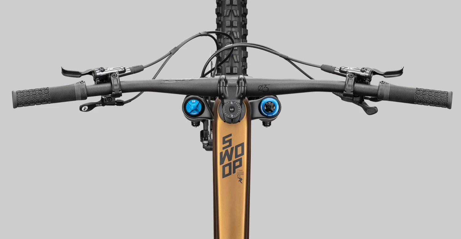 Die Vorgaben bei der Entwicklung für das SWOOP in der Carbonvariante waren klar – frisches Design, moderne Kinematik und neue Dämpferanlenkung. Da ist kein Stein ist auf dem alten geblieben. Dennoch haben wir die DNA des beliebten SWOOP AL in Teilen beibehalten – progressive Geometrie, 29″ Laufräder, Möglichkeit der Geometrieverstellung, 170mm Federweg – hier wurden keine Kompromisse eingegangen. Die Kinematik des SWOOP ist progressiv ausgelegt, auch Coil Dämpfer passen gut zur Charakteristik des Bikes. Für eine hohe Wendigkeit konnten wir die Kettenstreben mit 438mm kurz halten, trotz des langen Radstands und der flachen Winkel sind enge Kurven kein Hindernis. Anstatt eines Flip Chips für die Geometrieanpassung haben wir den Steuersatz verstellbar gestaltet, so sind die Schalen mit Winkeln versehen und können gedreht werden, um den Steuerwinkel um 1,5 Grad zu variieren.